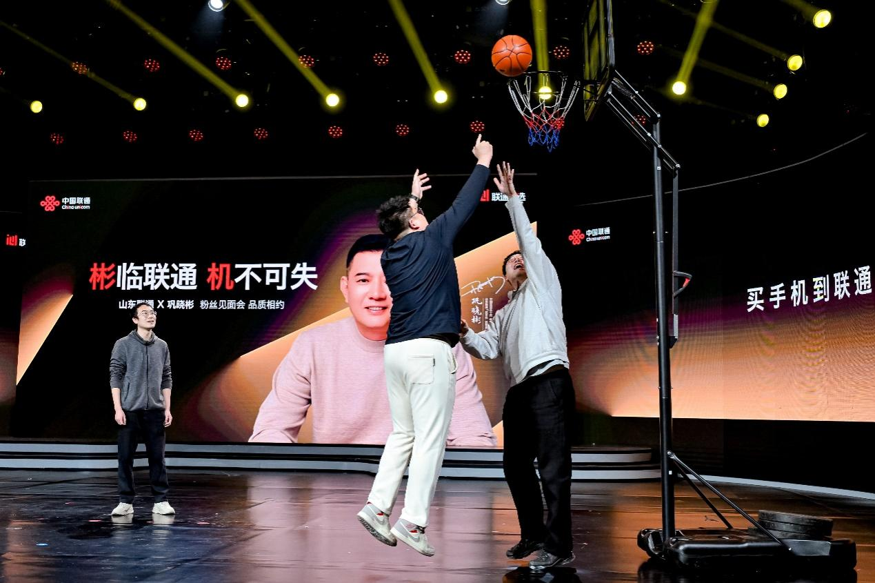 现场特设趣味互动环节,成为整场活动的一大亮点。粉丝们踊跃登台,模仿巩晓彬经典的梦幻脚步上篮,“逍遥王”亲自现场点评,亲和力十足;同时增设趣味抢答环节,邀请 5 位观众登台,在台上抢麦回答问题,题目涵盖巩晓彬篮球生涯高光时刻、山东联通品牌服务优势等内容,引发台下观众阵阵欢呼与积极响应。所有登台模仿梦幻脚步上篮的粉丝,均获赠巩晓彬现场手签篮球;参与抢麦抢答的观众则收获联通文创优胜奖及纪念奖品。